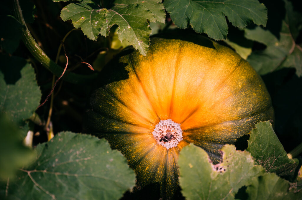 2. Chaussures fermées, vêtements à manches longues, pantalons longs et chapeau sont souvent de mise. Même si à l’automne, il n’y a plus de moustiques, les tiges des citrouilles peuvent être quelque peu piquantes.