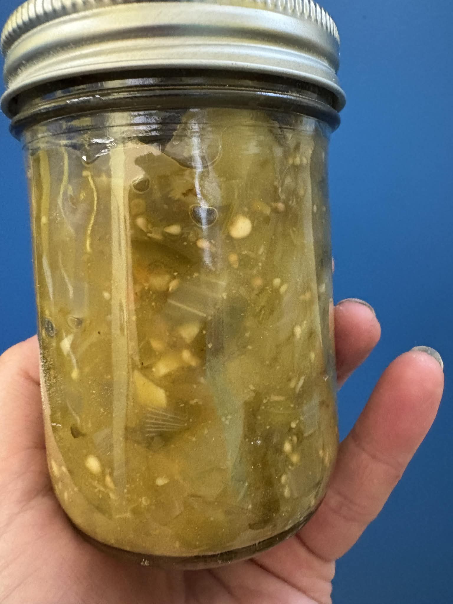 Tomates vertes, piments jalapeno, piments serrano et ail du Jardin des pins, oignon rouge, jus de lime, coriandre, cumin, origan, sel et poivre