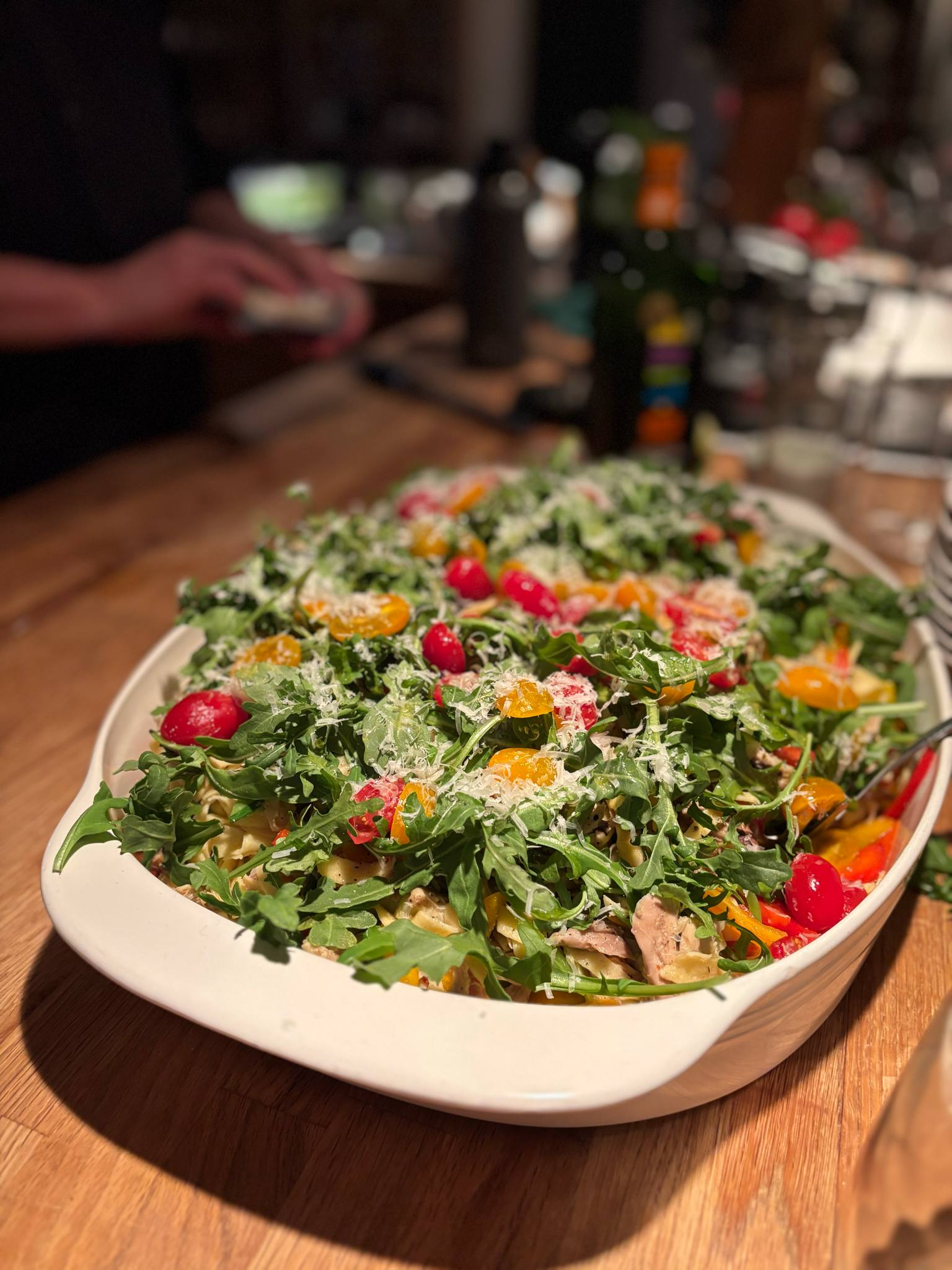 - Verser le tout dans un grand plat de service. Garnir des tomates cerises et napper de l’huile de macération. Recouvrir de roquette, ajouter le parmesan râpé et servir.